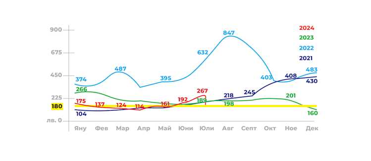 След приключването й през март миналата година таванът на компенсацията от 200 лв./МВтч бе надхвърлен само два пъти - през октомври и през ноември 2023 г., когато средните цени на борсата достигнаха съответно 201 лв./МВтч и 209 лв./МВтч. Ако обаче през целия период след 31 март 2023 г. мерките бяха валидни и таванът за компенсации бе с базова цена от 180 лв./МВтч, тогава бизнесът щеше да получава помощи още през миналата година за месеците април (193 лв./МВтч), юли (189 лв./МВтч), август (198 лв./МВтч), септември (199 лв./МВтч) и за юни 2024 г. (192 лв./МВтч).